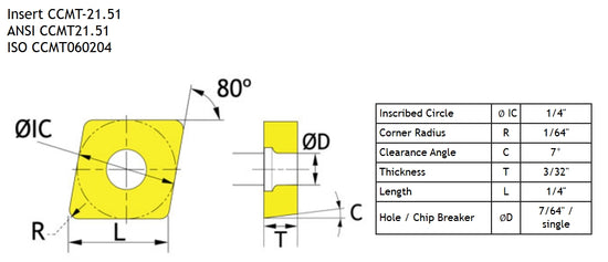 CCMT-21.51 carbide insert is a 80° diamond with a 7° relief. The center hole is a 40°-60° single countersink, and a single-sided chip breaker.