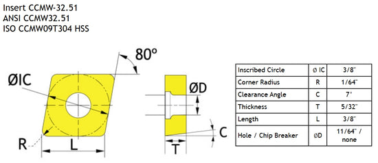 The insert is designated CCMW32.51 (ANSI) or CCMW09T304 HSS (ISO). For a list of compatible LittleMachineShop.com products, see the Compatibility tab.