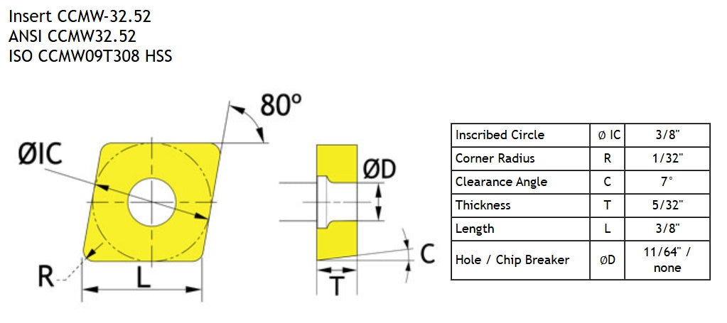 The insert is designated CCMW32.52 (ANSI) or CCMW09T308 HSS (ISO). For a list of compatible LittleMachineShop.com products, see the Compatibility tab.