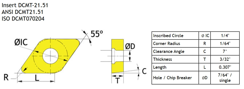 DCMT-21.51 carbide insert is a 55° diamond with a 7° relief. The center hole is a 40°-60° single countersink, and a single-sided chip breaker.