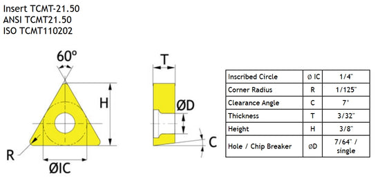 The insert is designated TCMT21.50 (ANSI) or TCMT110202 (ISO). For a list of compatible LittleMachineShop.com products, see the Compatibility tab.