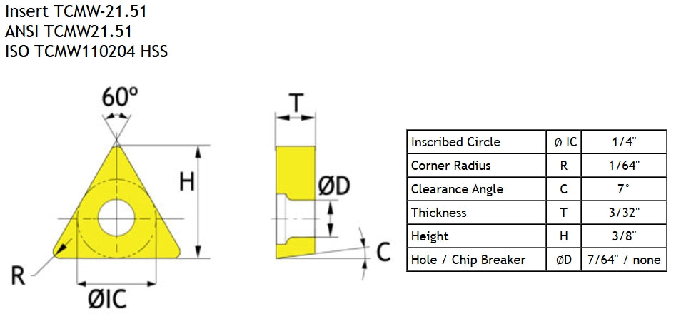 The insert is designated TCMW21.51 (ANSI) or TCMW110204 HSS (ISO). For a list of compatible LittleMachineShop.com products, see the Compatibility tab.