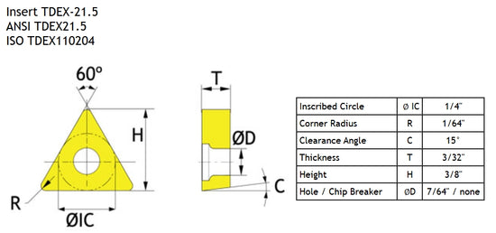 The insert is designated TDEX21.5 (ANSI) or TDEX110204 (ISO). For a list of compatible LittleMachineShop.com products, see the Compatibility tab.