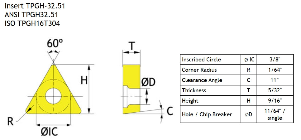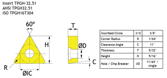 TPGH-32.51 carbide insert is a 60° triangle with a 11° relief. The center hole is a 70°-90° single countersink, and a single-sided chip breaker.
