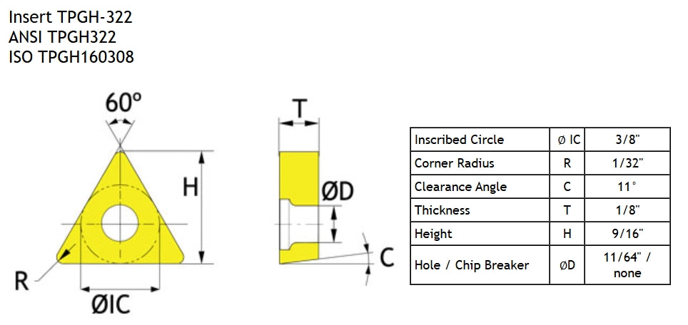 TPGH-322 carbide insert is a 60° triangle with a 11° relief. The center hole is a 70°-90° single countersink, and a single-sided chip breaker.
