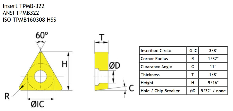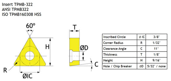 The insert is designated TPMB322 (ANSI) or TPMB160308 HSS (ISO). For a list of compatible LittleMachineShop.com products, see the Compatibility tab.