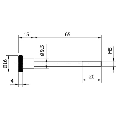 The unthreaded shaft is 9.5mm diameter and 45mm in length. The threaded portion is 20mm in length and is 5mm threading.